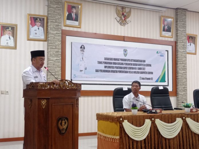 BERITASERUYAN.COM- Bupati Seruyan Yulhaidir membuka secara resmi sosialisasi manfaat program BPJS Ketenagakerjaan dan teknis pembayaran iuran bagi perangkat desa, di Aula BKAD Seruyan, Senin (9/11).