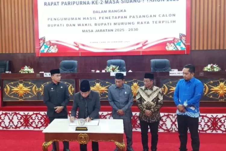 Selanjutnya Ketua DPRD Murung Raya mempersilahkan Ketua KPU kabupaten Murung Raya Okto Dinata membacakan pengumuman pasangan Bupati dan Wakil Bupati Murung Raya terpilih masa jabatan tahun 2025 – 2030 yang dilanjutkan dengan penandatanganan berita acara pengumuman pasangan Bupati dan Wakil Bupati Murung Raya.