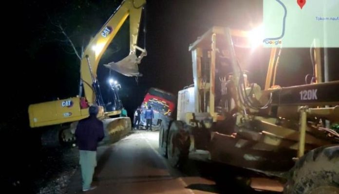 Dikatakan Kadis PUPR, evakuasi sudah dilakukan dari tadi malam sekitar pukul 21.15 WIB sampai dengan 01.45 WIB dini hari. Karena cuaca dilokasi hujan, maka kegiatan evakuasi di hentikan dan akan dilanjutkan pagi ini dengan menambah alat berat berupa crane dari alat berat yang sudah ada terlebih dahulu dilokasi greader dan exavator bantuan dari PT MPG.