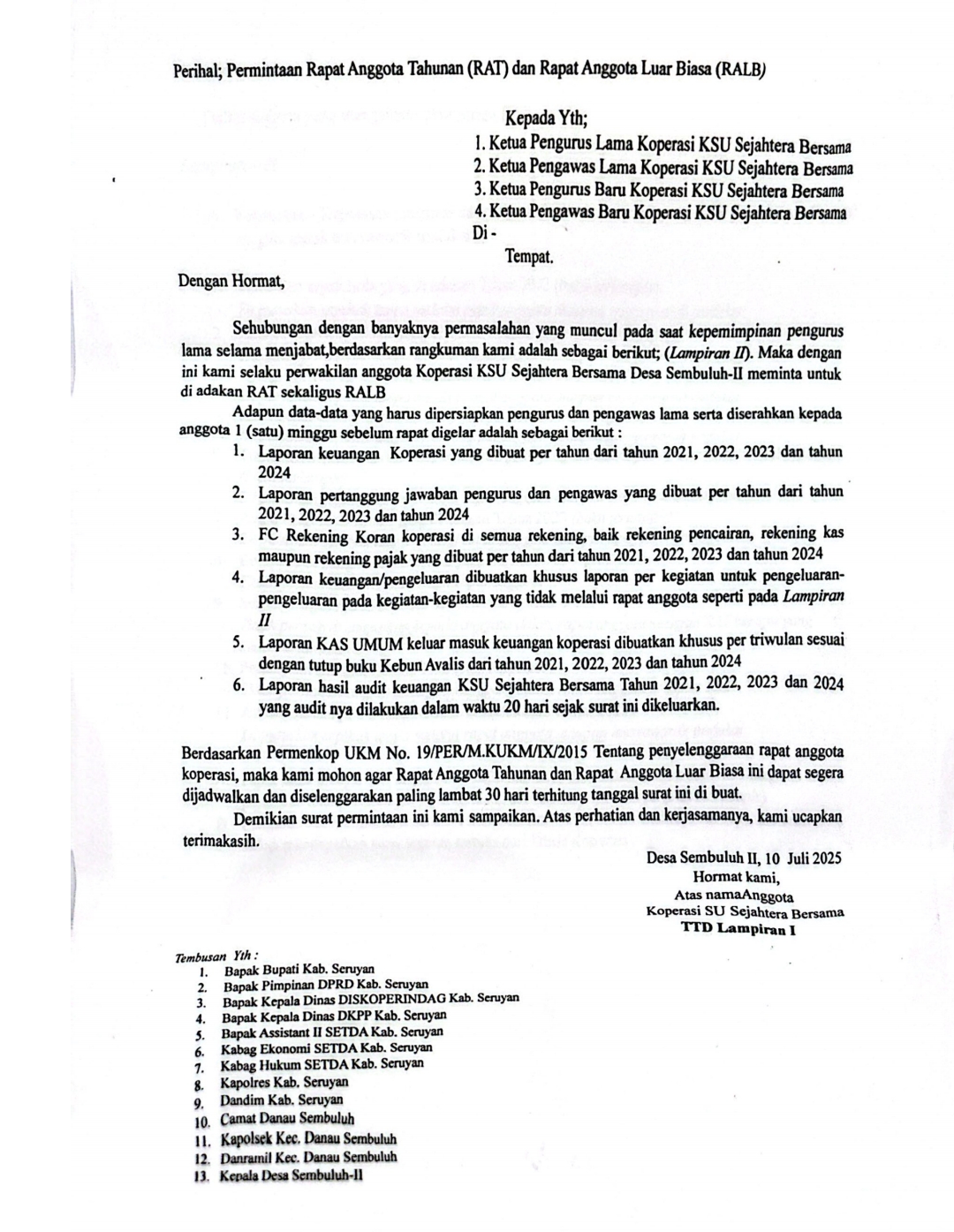 BERITASERUYAN.COM- Sejumlah anggota Koperasi Serba Usaha (KSU) Sejahtera Bersama secara resmi melayangkan surat kepada Ketua pengurus lama, Ketua Pengawas lama, Ketua pengurus yang baru dan Ketua pengawas koperasi yang baru untuk segera melaksanakan Rapat Anggota Tahunan (RAT) dan Rapat Anggota Luar Biasa (RALB).
