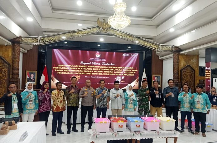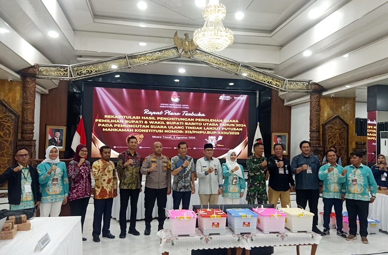 Muara Teweh – Pemerintah Kabupaten Barito Utara bersama Komisi Pemilihan Umum (KPU) Barito Utara menggelar rapat pleno terbuka rekapitulasi hasil penghitungan suara ulang (PSU) Pilkada Tahun 2024 (Tindak lanjut Putusan MK Nomor 313 Tahun 2025) di Gedung Balai Antang Muara Teweh, Sabtu (9/8/2025).