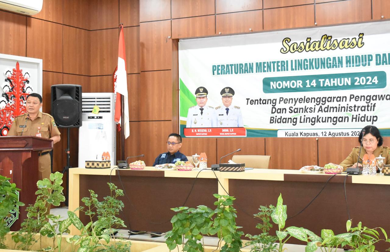 KUALA KAPUAS – Pemerintah daerah (Pemda) Kabupaten Kapuas menggelar sosialisasi Peraturan Menteri Lingkungan Hidup dan Kehutanan (Permen LHK) Nomor 14 Tahun 2024 tentang Penyelenggaraan Pengawasan dan Sanksi Administratif Bidang Lingkungan Hidup.