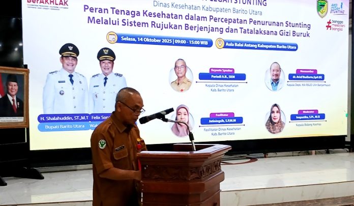 Muara Teweh – Kepala Dinas Kesehatan Barito Utara, Pariadi AR, menegaskan bahwa penanganan stunting menjadi prioritas utama pemerintah daerah dan membutuhkan keterlibatan lintas sektor dari desa hingga fasilitas rujukan. Pernyataan ini disampaikan saat membuka Pelatihan Aksi Cegah Stunting di Gedung Balai Antang Muara Teweh, Selasa (14/10/2025).