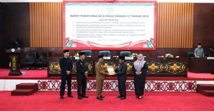 PURUK CAHU – DPRD Kabupaten Murung Raya (Mura) menggelar Rapat Paripurna Ke-6 Masa Sidang III di Gedung DPRD setempat, Jumat (7/11/2025). Rapat dihadiri Bupati Murung Raya Heriyus, Ketua DPRD Mura Rumiadi, Wakil Ketua I Dina Maulidah, Plt Sekda Sarwo Mintarjo, Asisten II Setda K. Zen Wahyu, anggota DPRD, kepala perangkat daerah, serta tamu undangan lainnya.